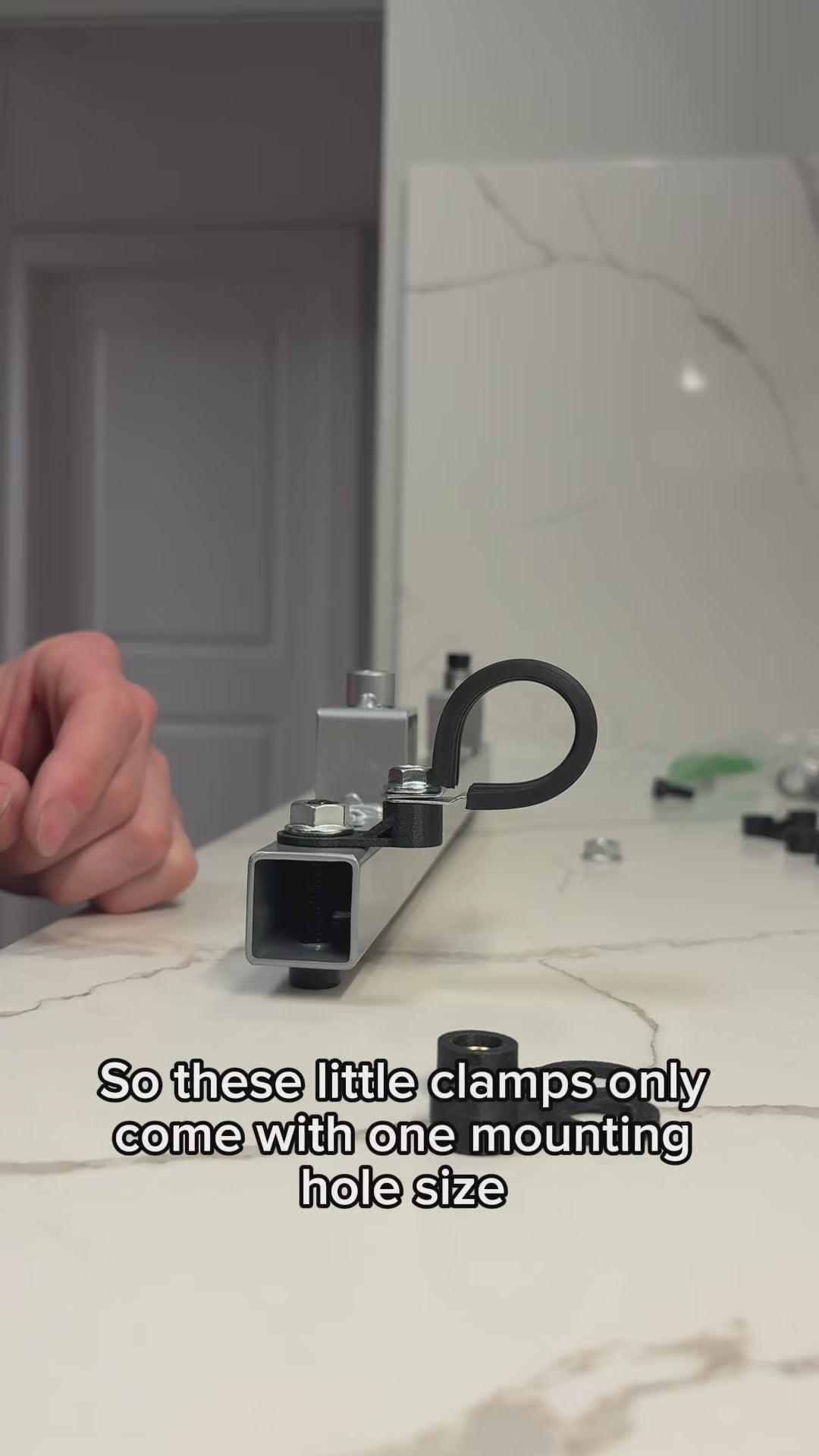 Gone are the days of trying to drill your Adel Clamp hole larger, often to no avail. With this uncomplicated yet innovative washer design, you can use simply screw the clamp to the washer and mount it to a bigger bolt.